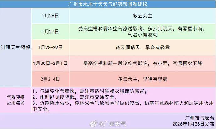 广东省气象台预计,1月27日,粤东、粤北、珠江三角洲南部市县有小雨,广东大部分市县有轻雾或雾,雨雾天气能见度低。1月26日夜间—28日有新的一股弱冷空气影响,广东大部市县有2~4℃的过程累积降温。